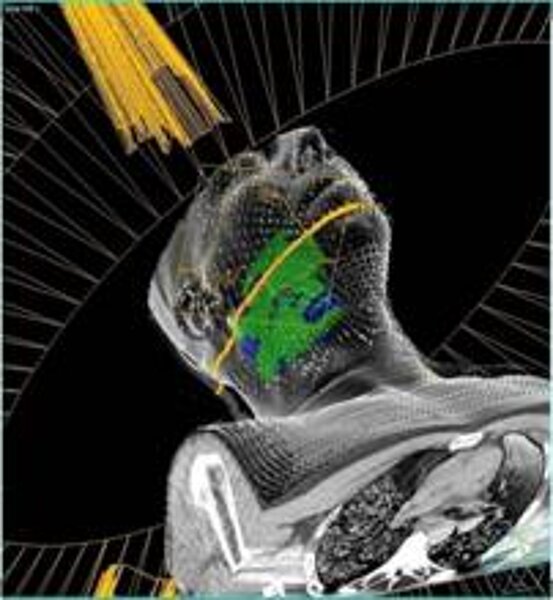 Die Stereotaxie ist eine sehr aufwändige Bestrahlung von kleinsten Tumoren mit höchster Präzision, z.B. im Gehirn oder in der Lunge. Die Patienten werden mit Hilfe von speziellen Lagerungssystemen fixiert, um während der Bestrahlung selbst kleinste Bewegungen zu verhindern.